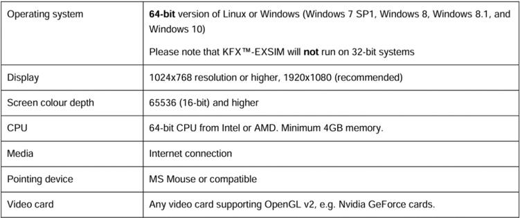The recommended specification for KFX/EXSIM is as follows: No Citrix, Microsoft, Oracle VirtualBox, VMware virtualization tools, e.g. XP mode on Windows7, are supported.